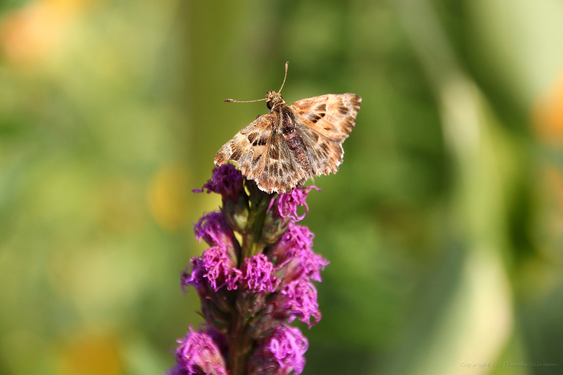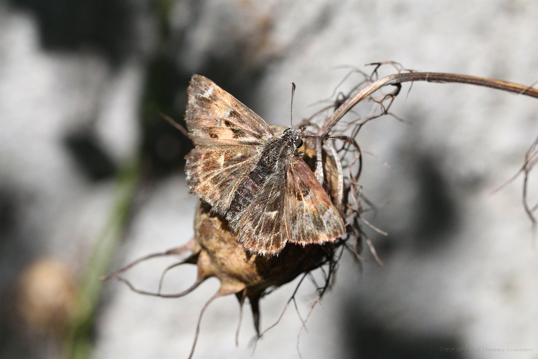 Ein Malven-Dickkopffalter (Carcharodus alceae) sonnt sich nochmal auf einer vertrockneten "Jungfer im Grünen"