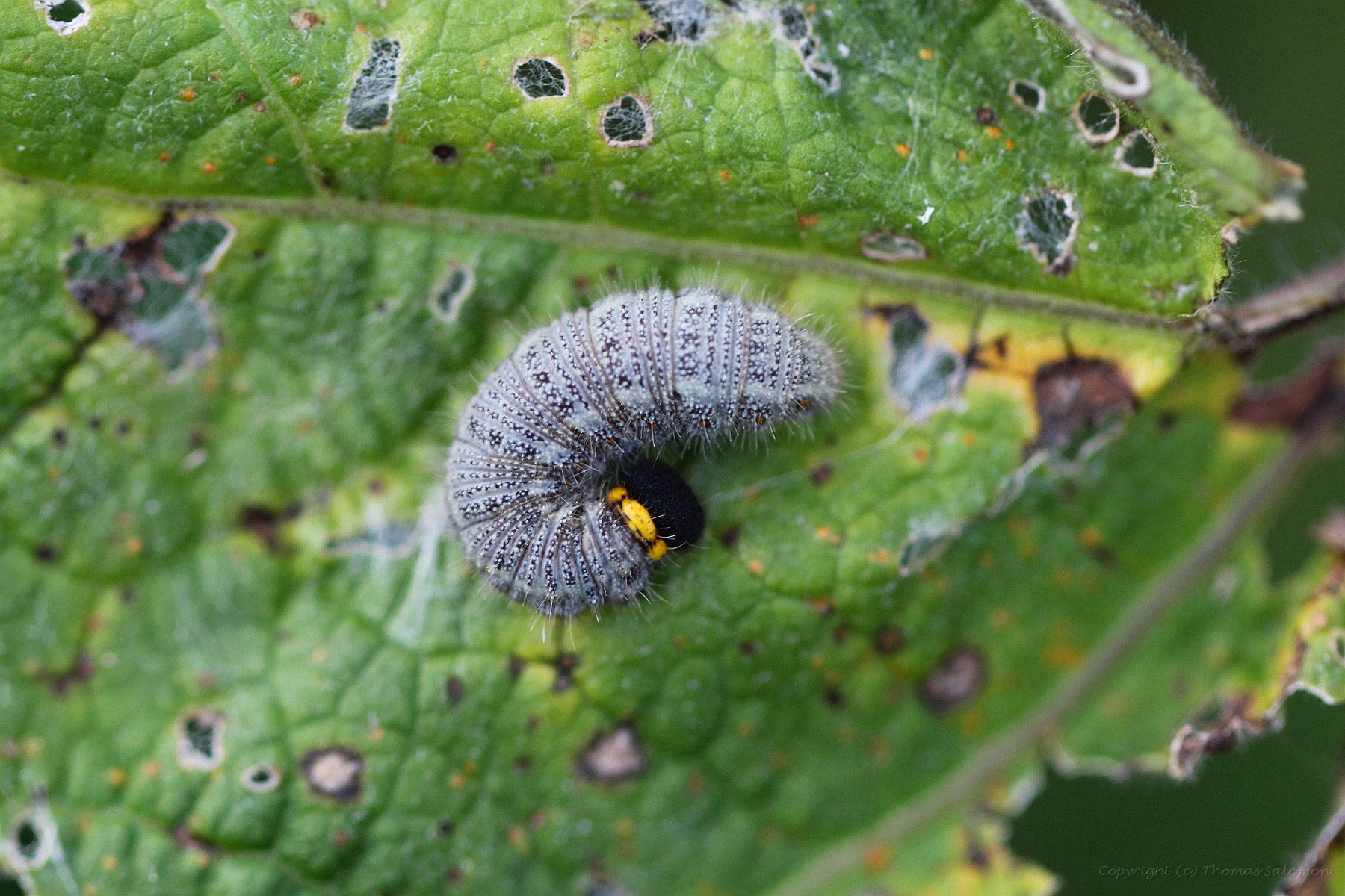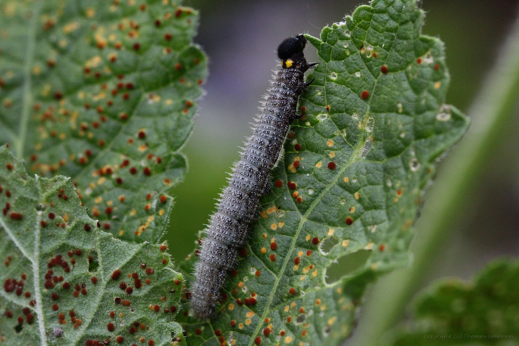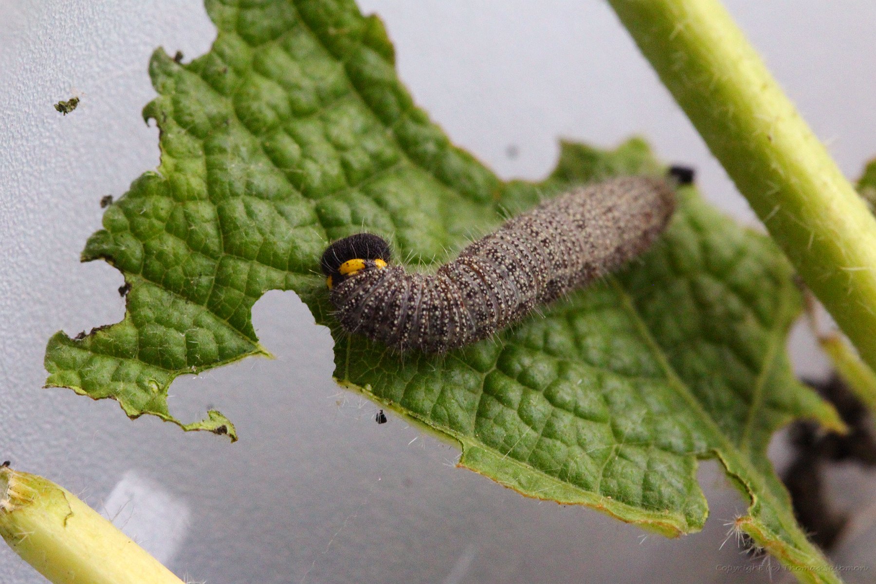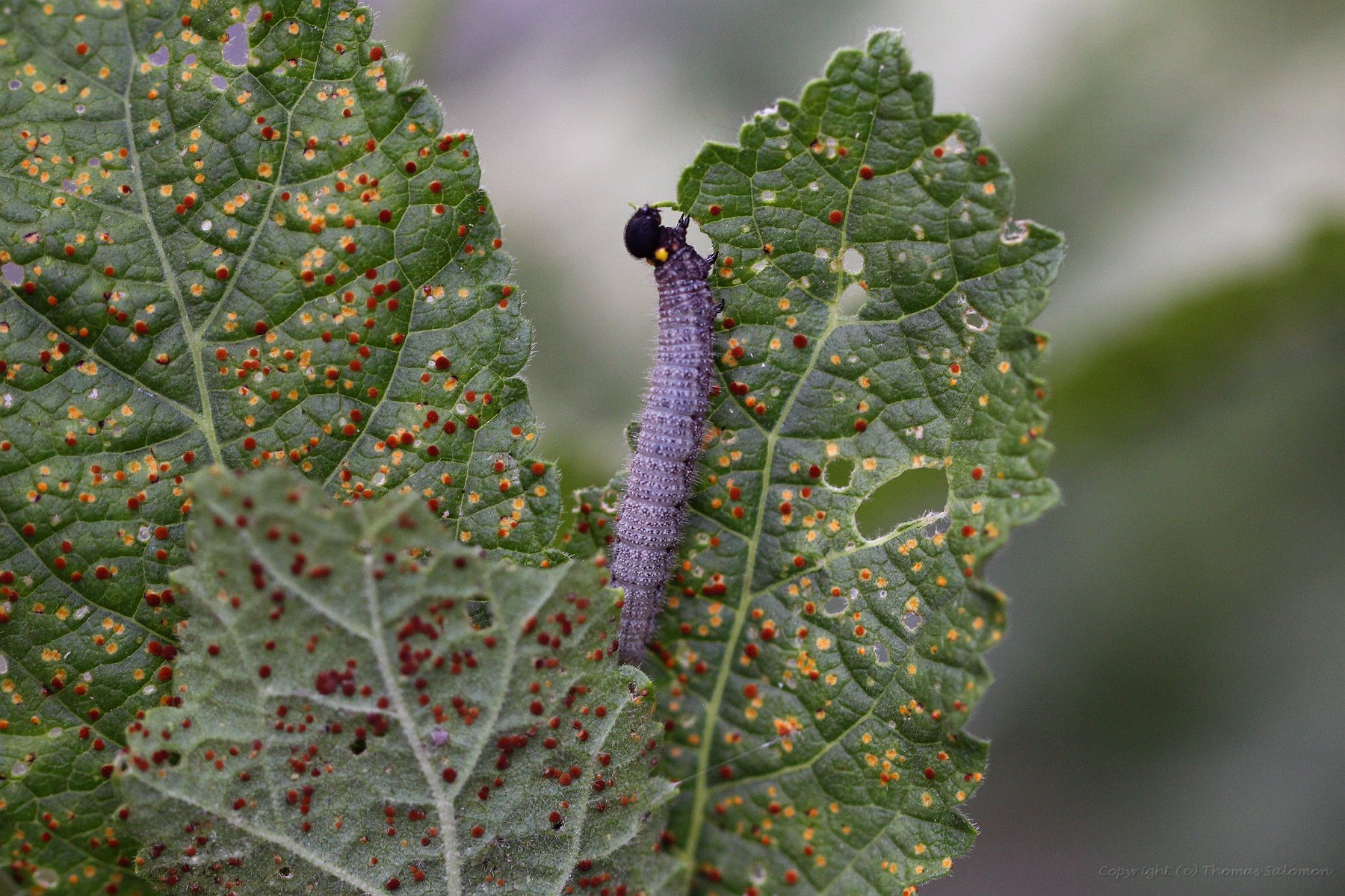 Die Raupe von Carcharodus alceae auf einer Stockrose. Ich habe für das Foto das normalerweise umgeklappte und "zugenähte" Blatt geöffnet.