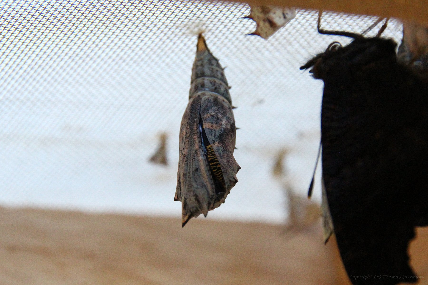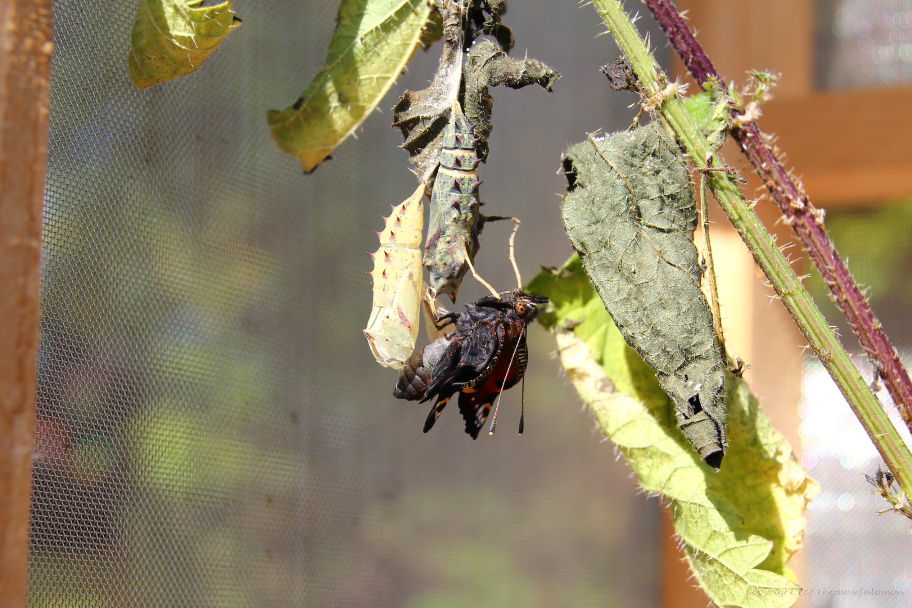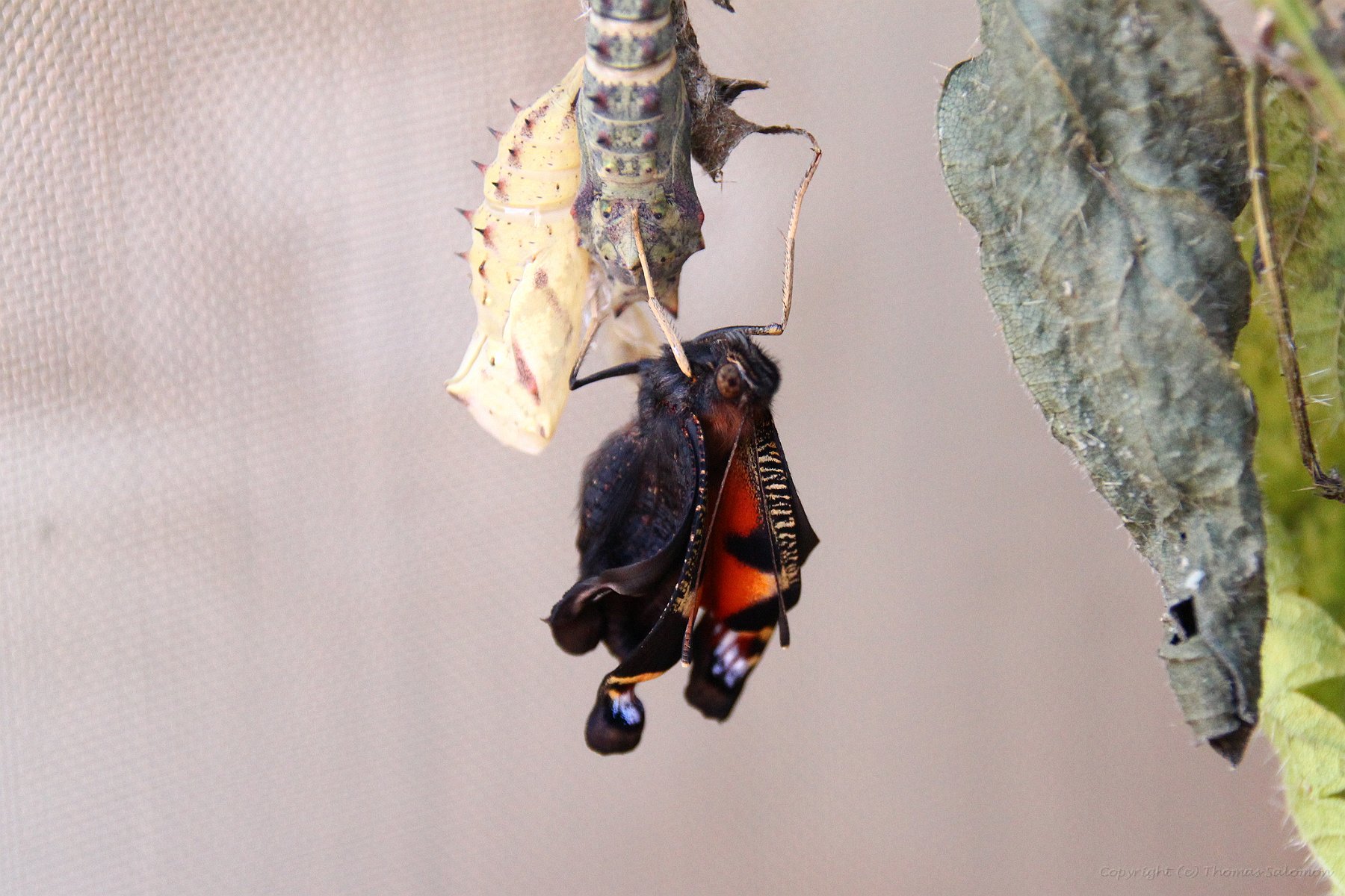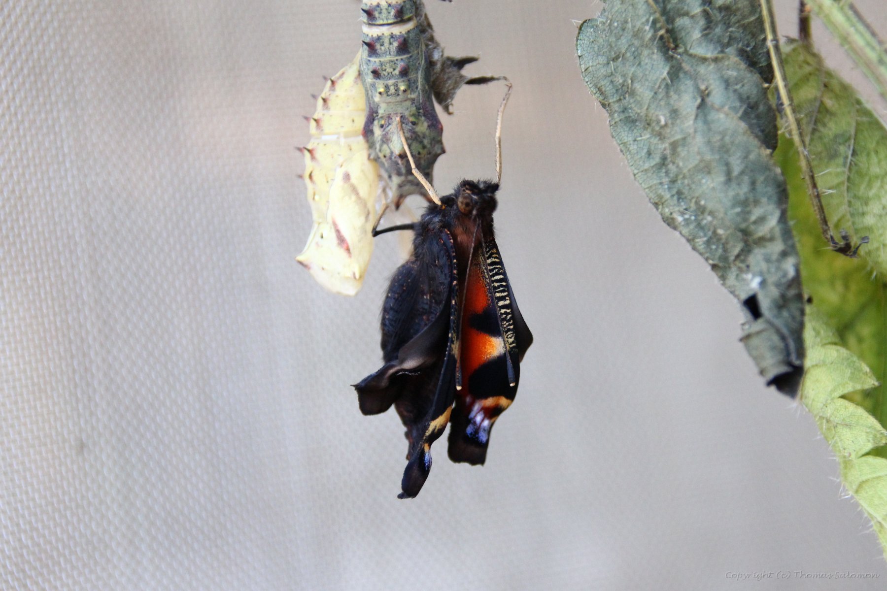 Der neue Falter (Aglais io) strecht seinen Oberkörper aus der Hülle. Antennen und Saugrüssel sind bereits zu erkennen.