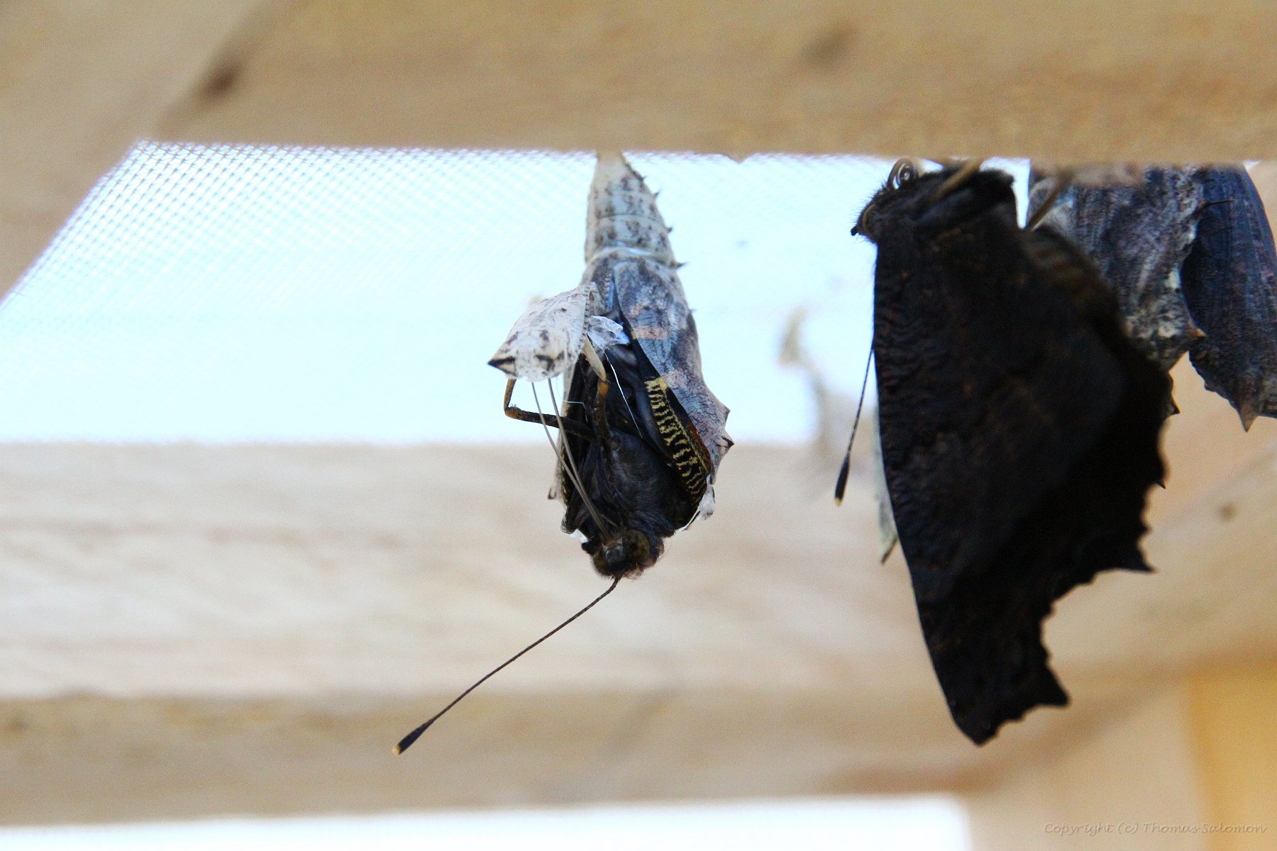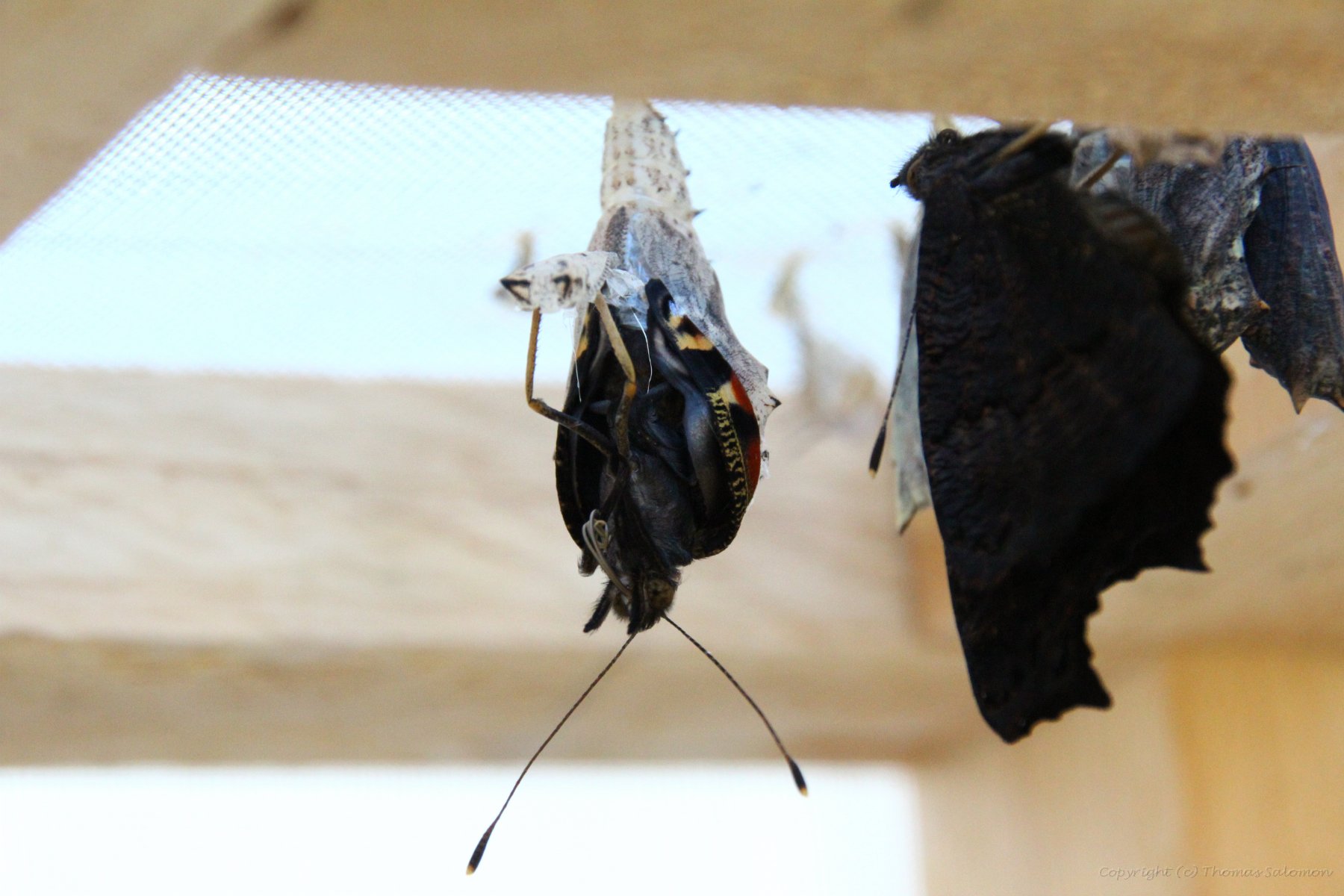 Hier ein anderes Exemplar von Aglais io, das es geschafft hat. Die Flügel sind noch extrem "verschrumpelt". Nun heißt es mit Blut "aufblasen" und dann trocknen.