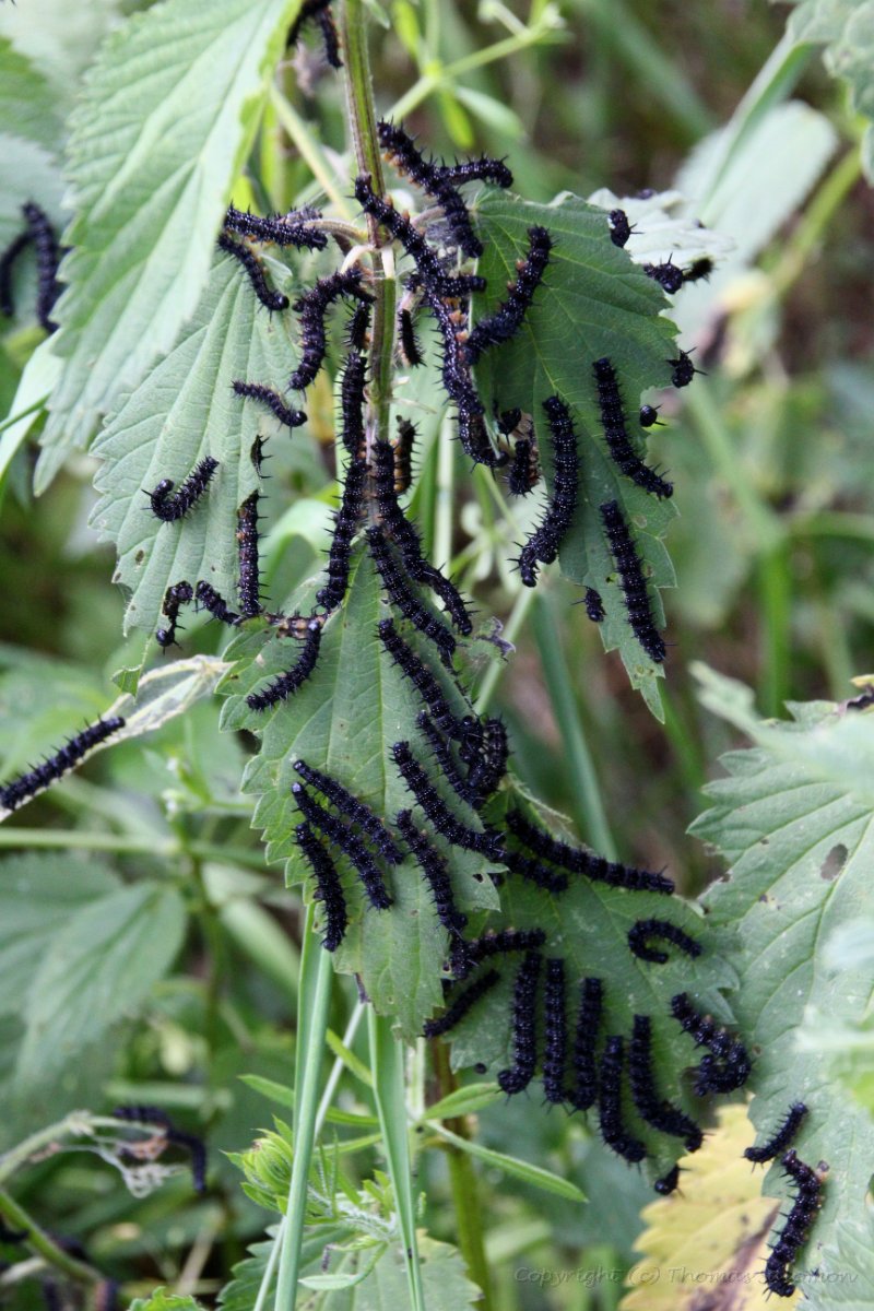 L2 Räupchen von Aglais io sind meist noch gesellig und manchmal an Brennnesseln zu Hunderten zu finden.