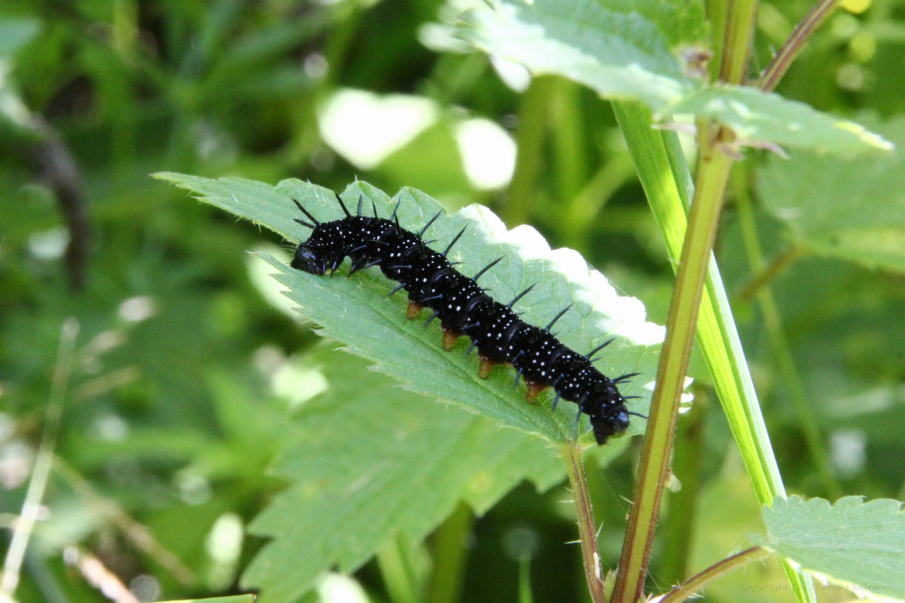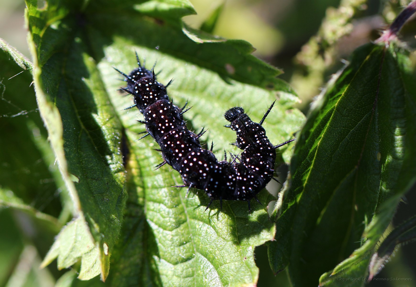 Eine Tagpfauenauge-Raupe. Deutlich sind die charakteristischen nicht verästelten Stacheln und die weißen Pünktchen zu erkennen.