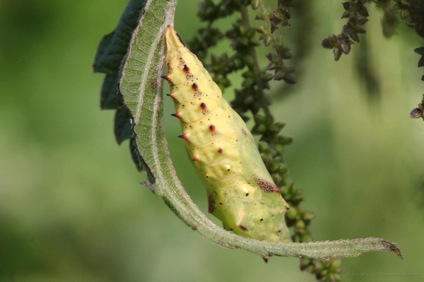 Die Puppe des Tagpfauenauges aus der Nähe betrachtet.