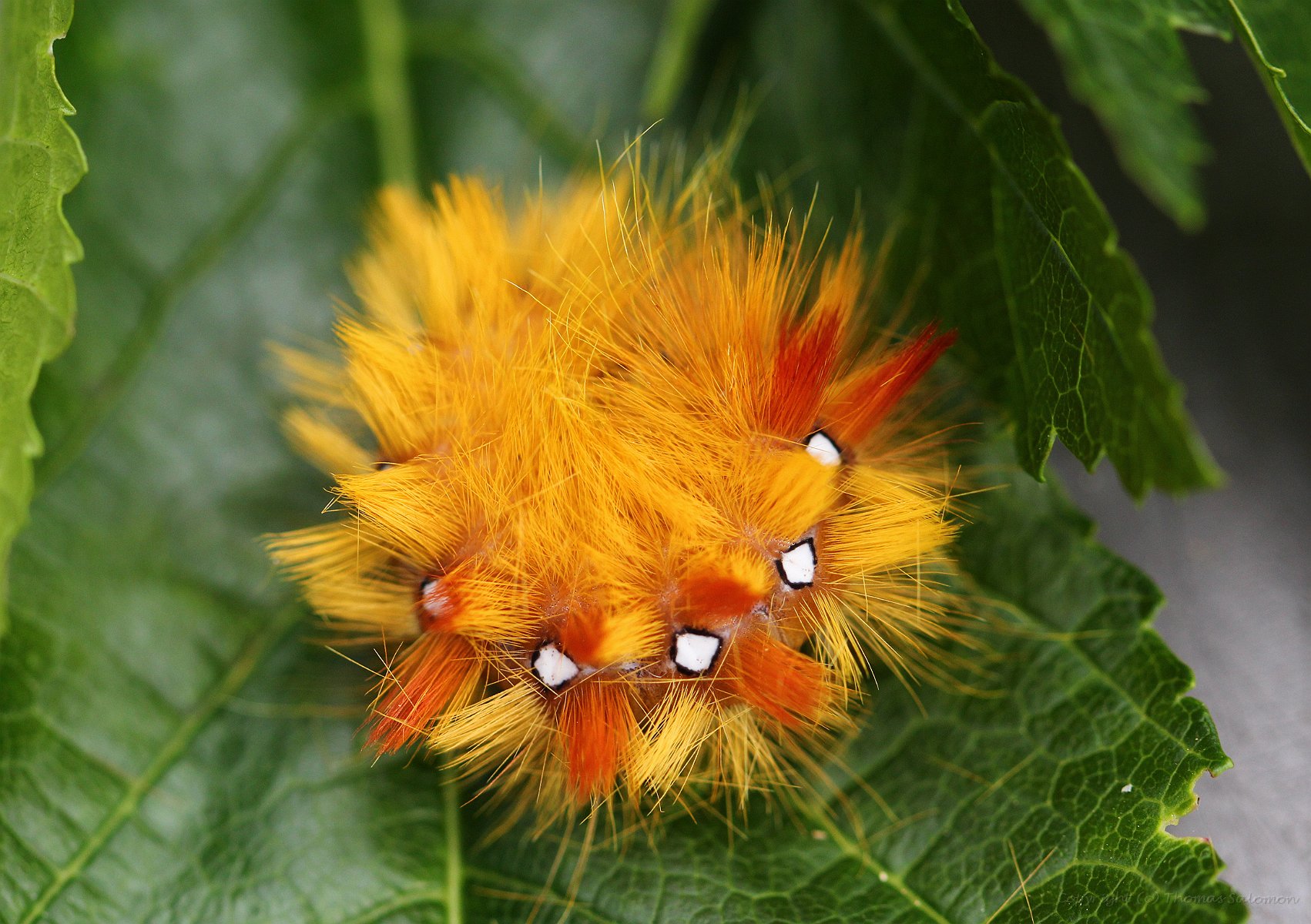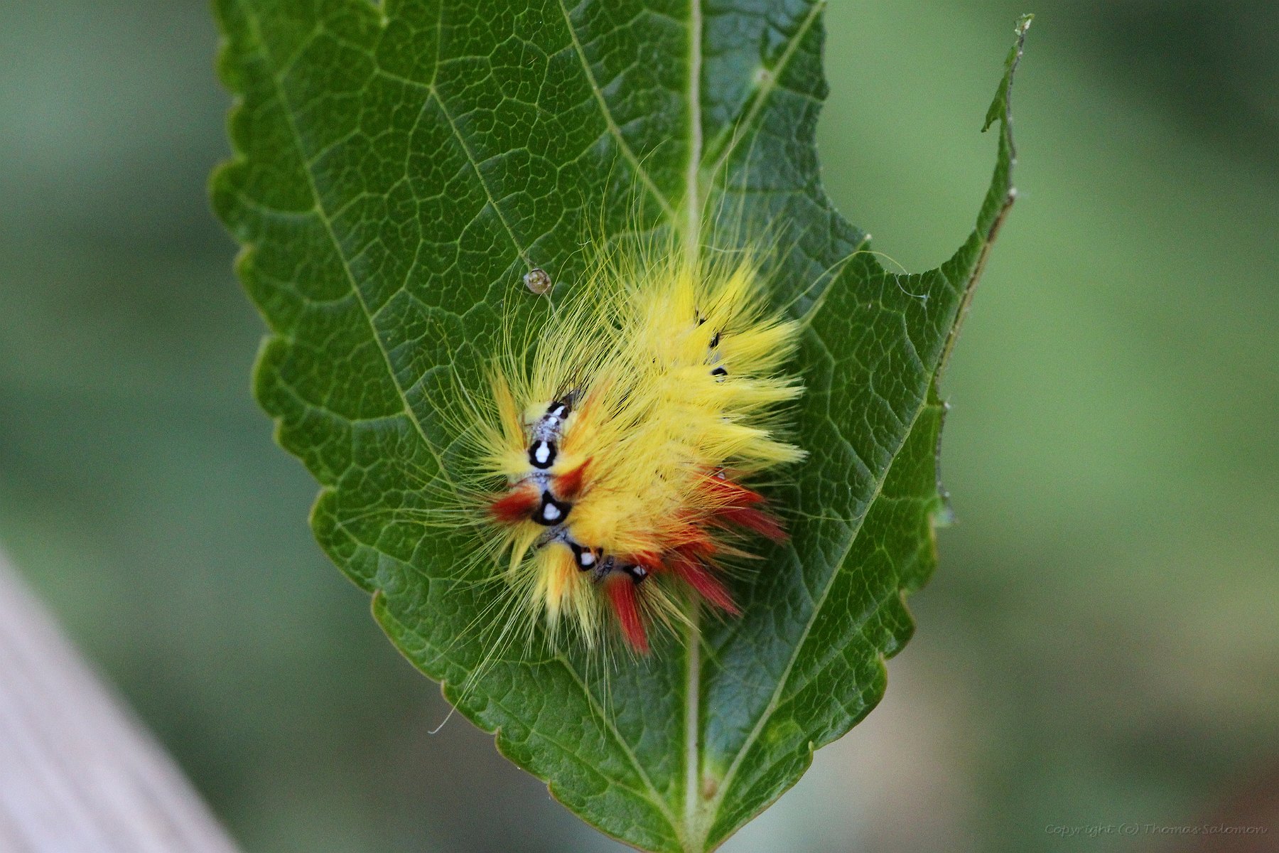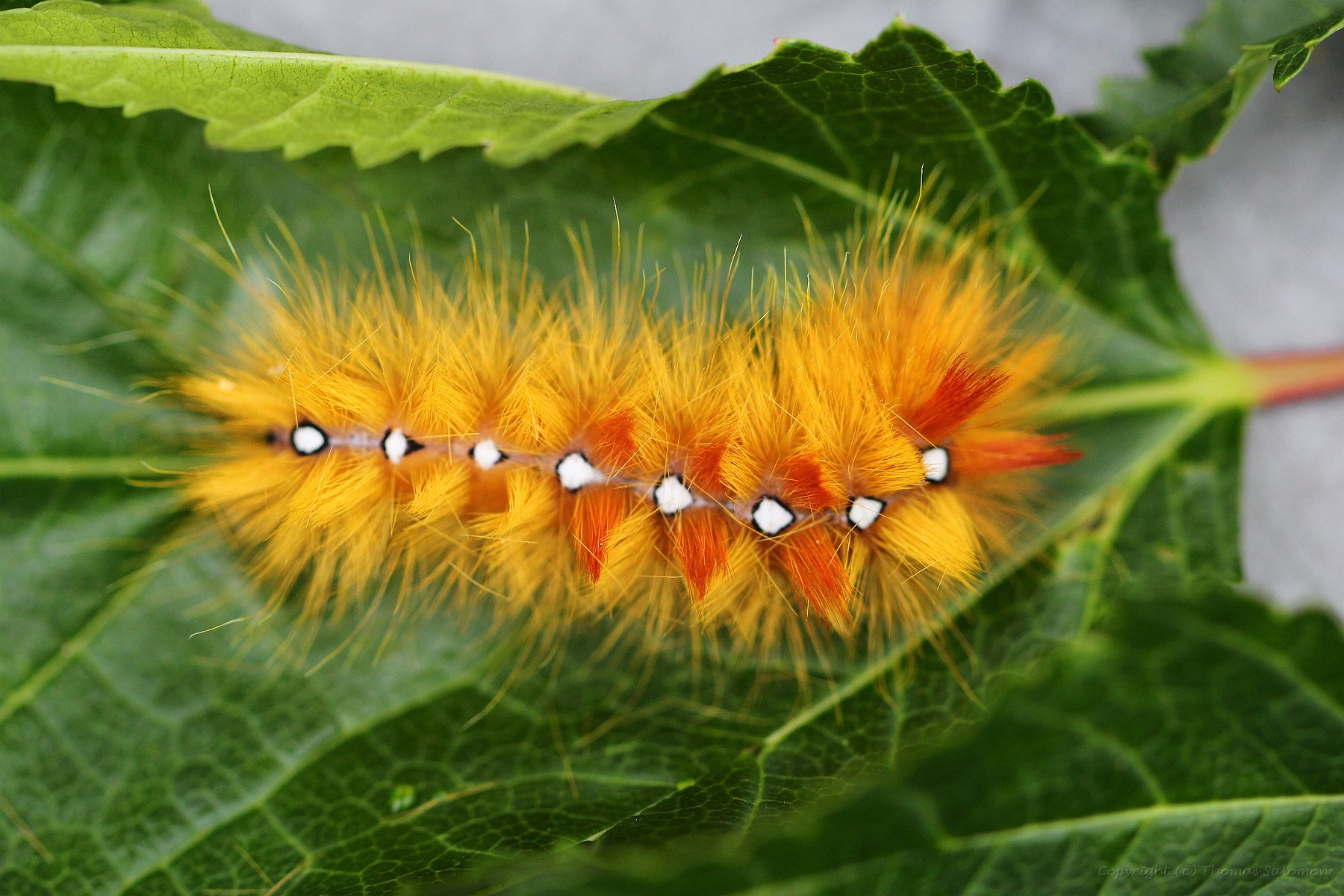 Die sehr auffällige Raupe einer Ahorn-Rindeneule (Acronicta aceris)
