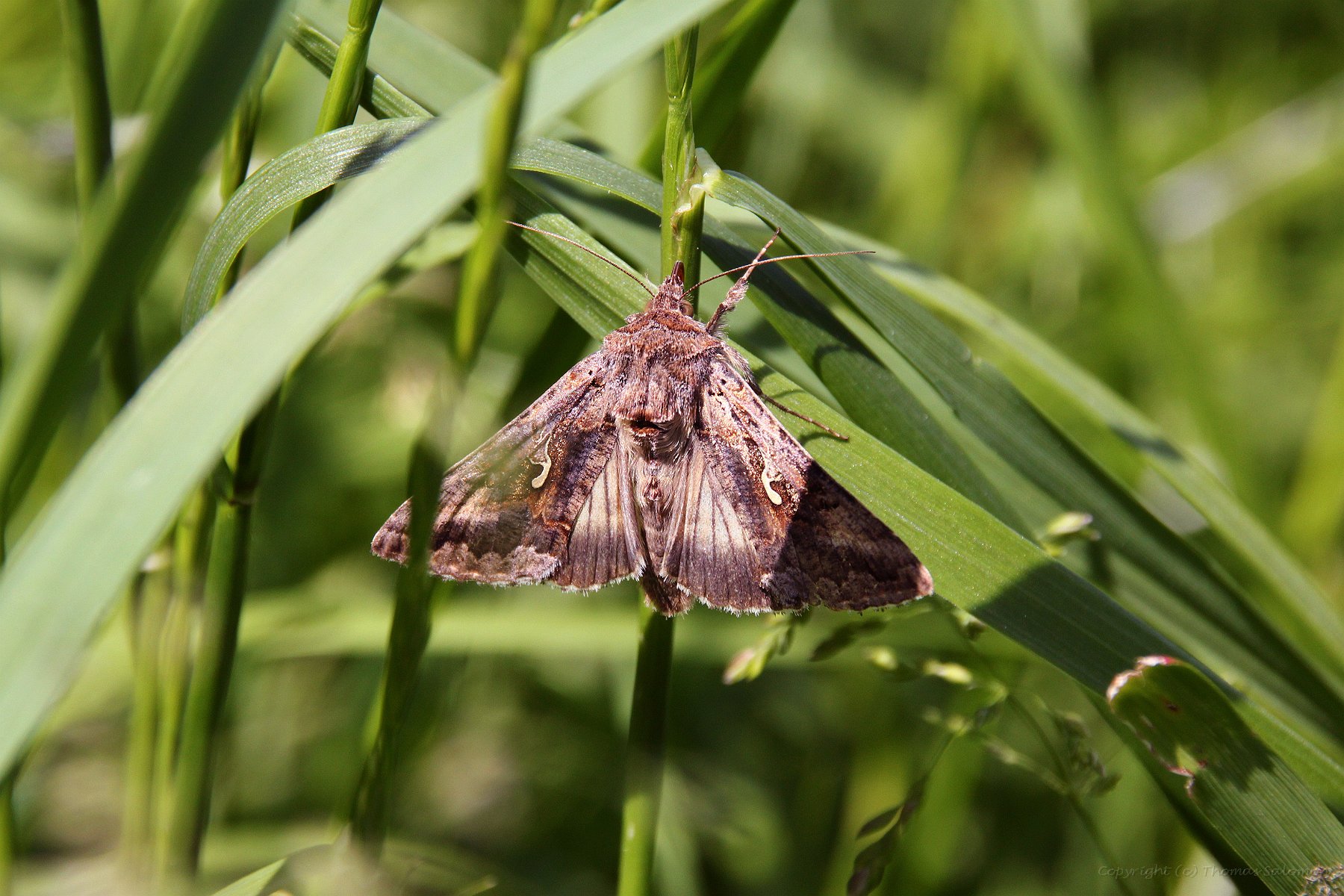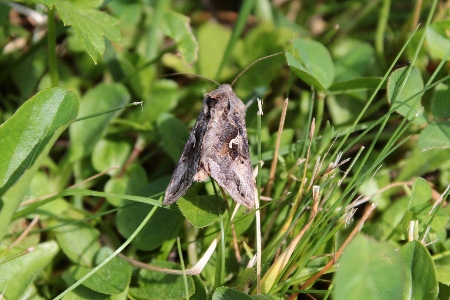 Eine Gammaeule (Autographa gamma) in Ruhestellung - deutlich ist das weiße Zeichen Gamma zu erkennen. |