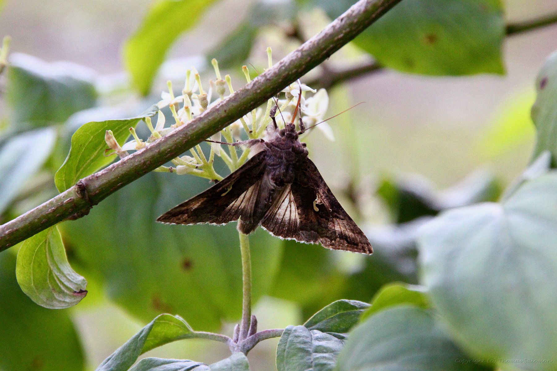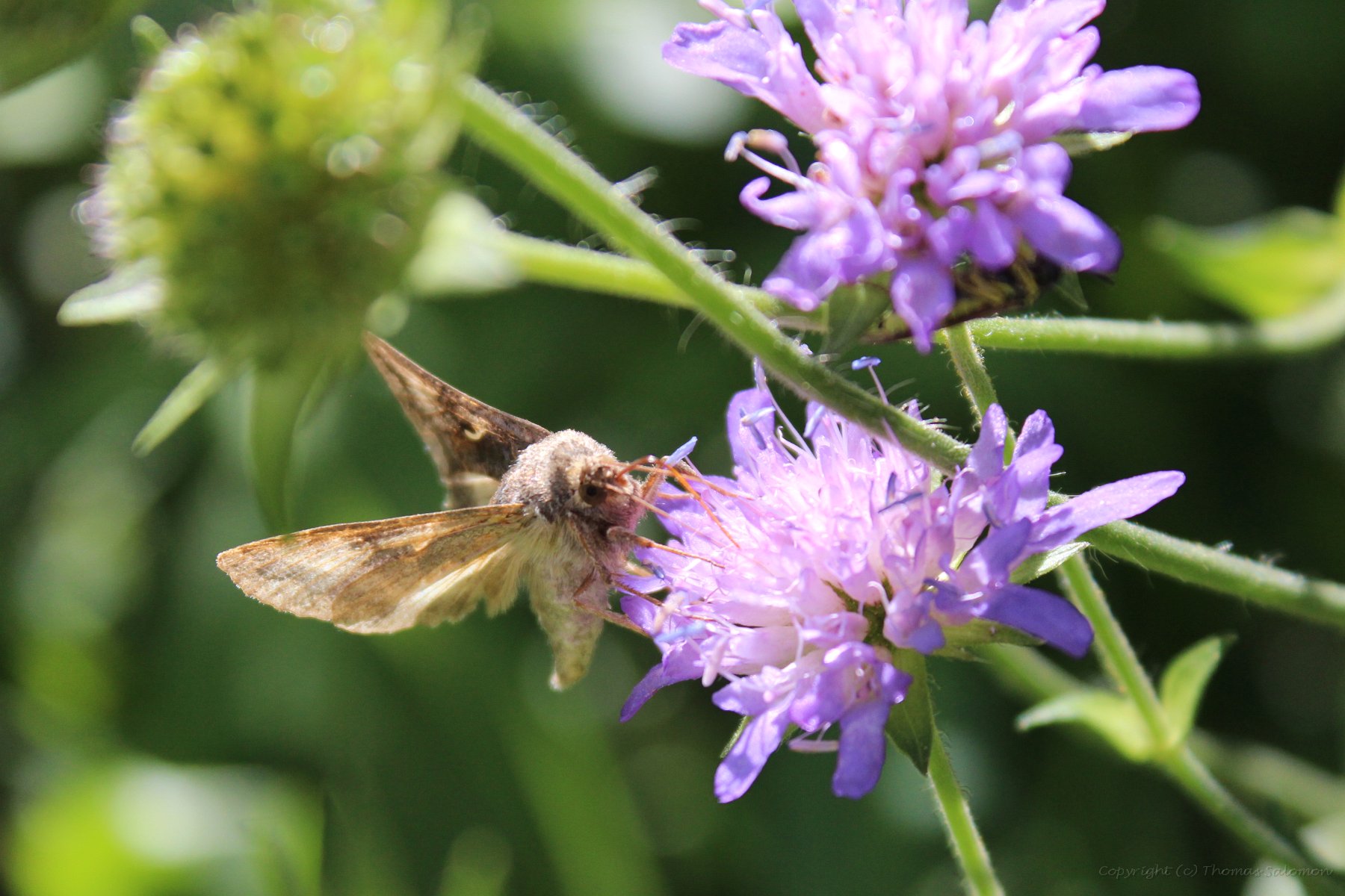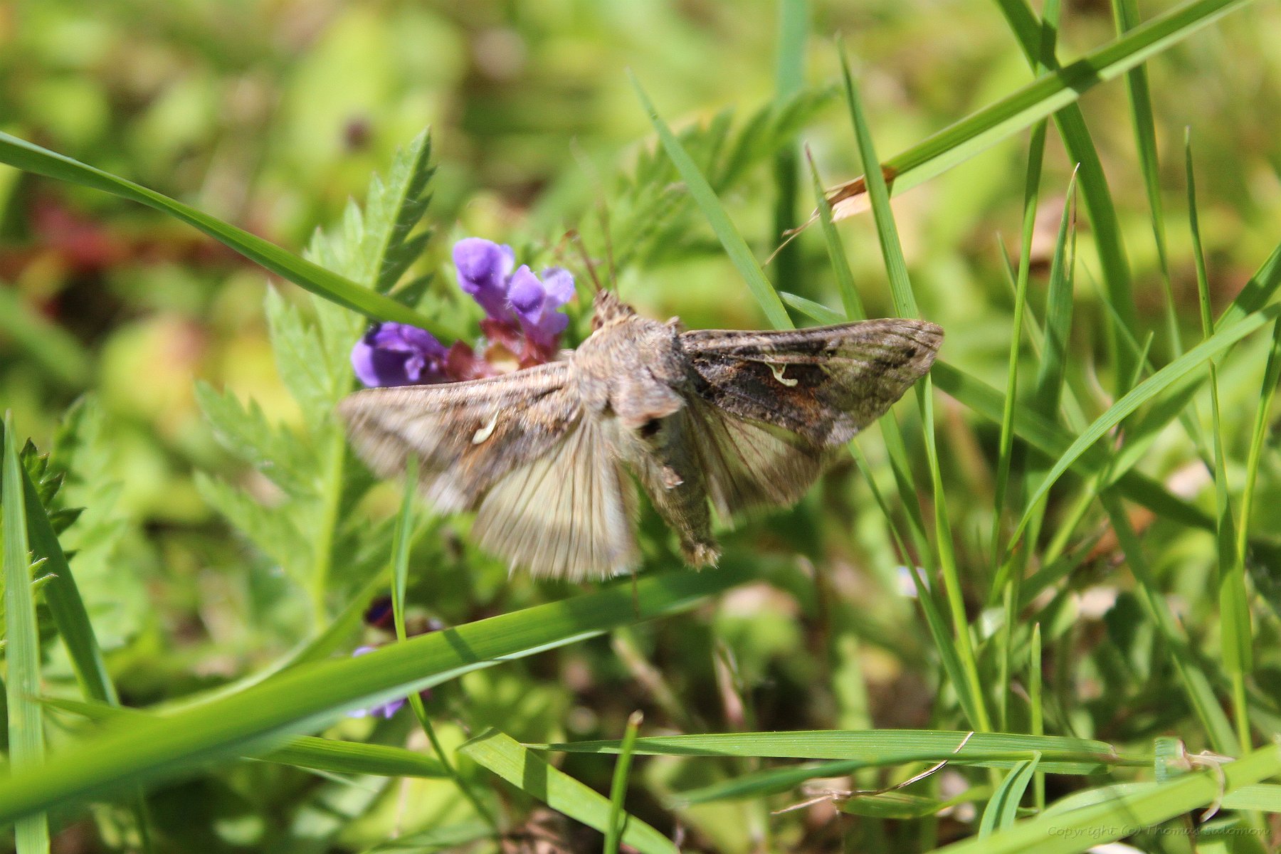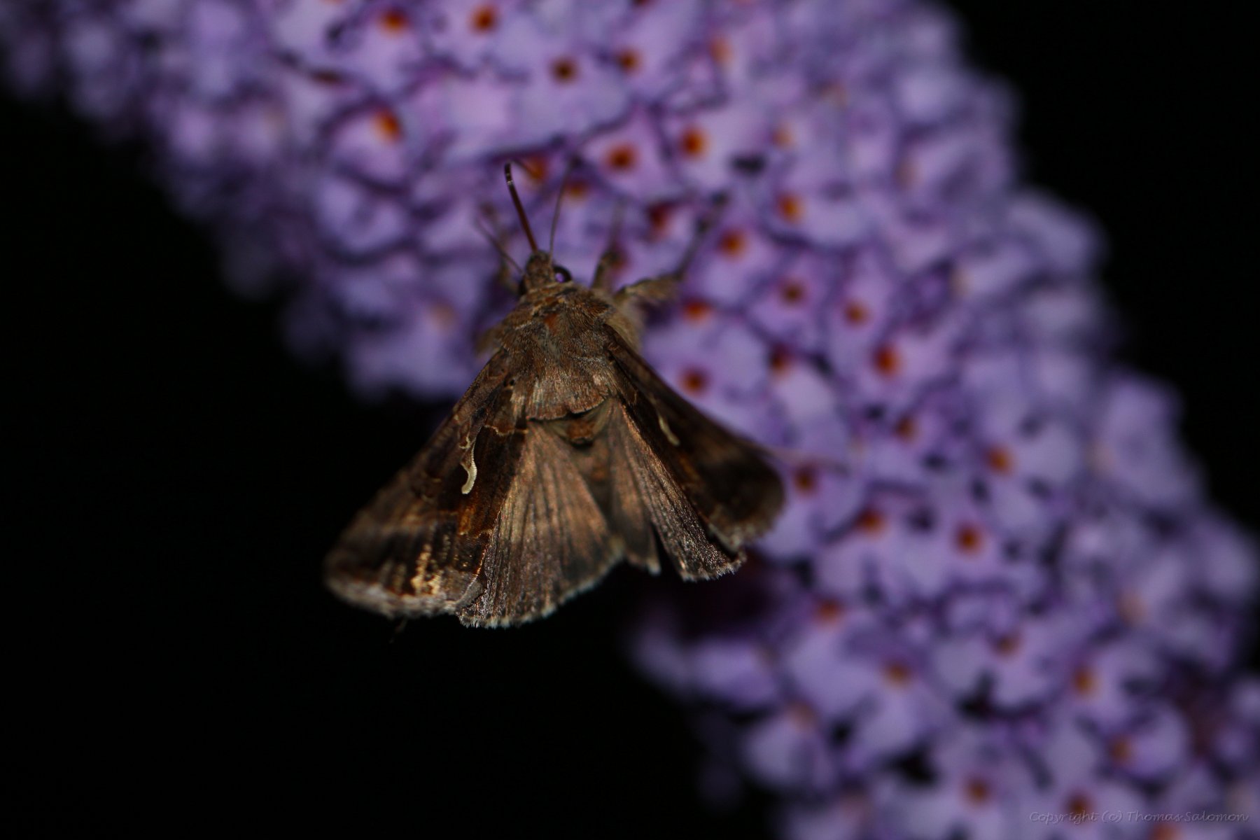 EIne Gammaeule (Autographa gamma) im Anflug auf einen Sommerflieder |