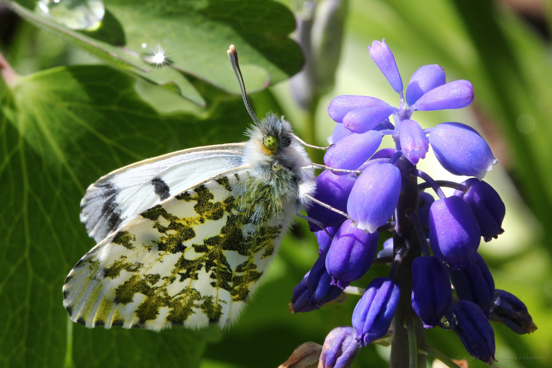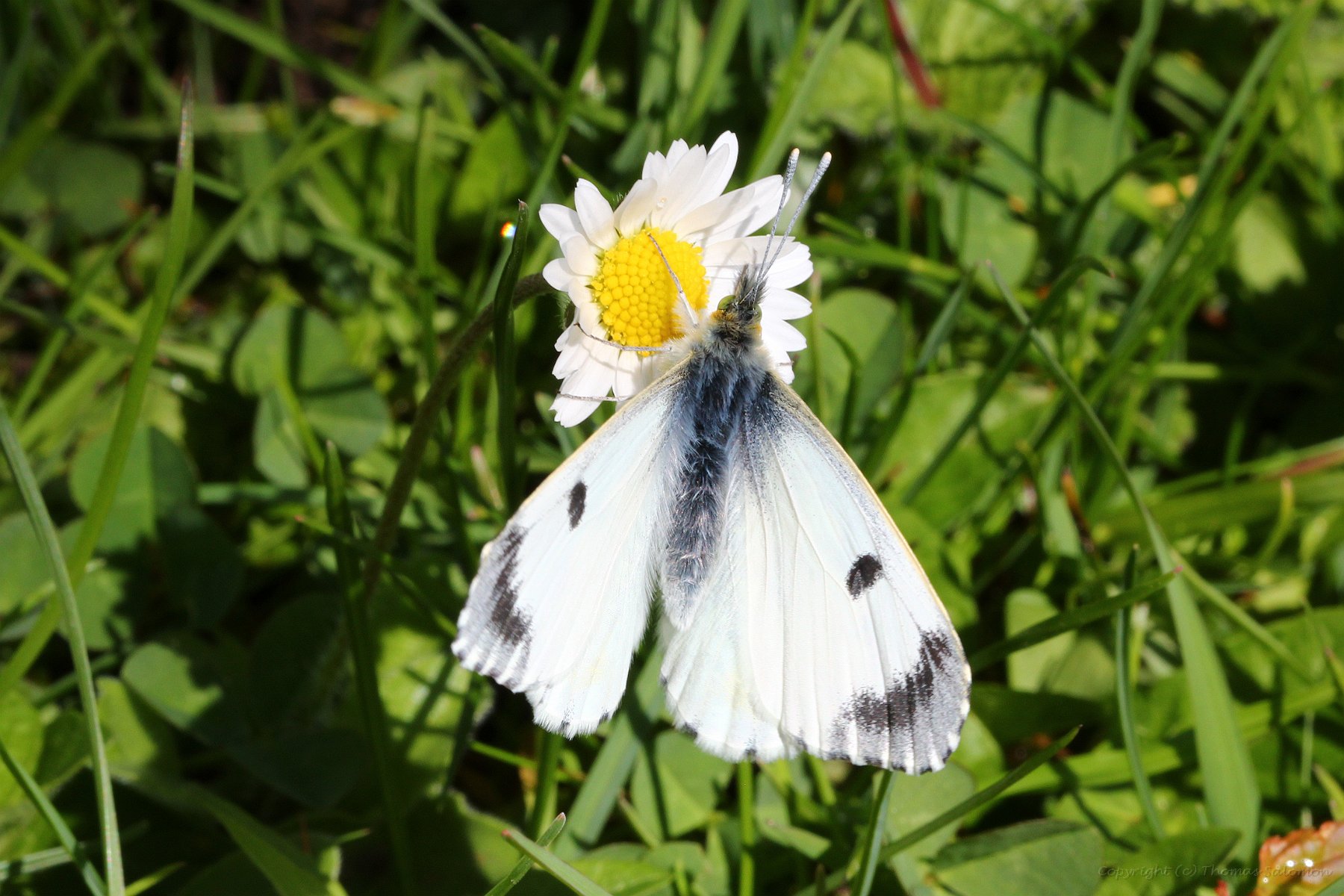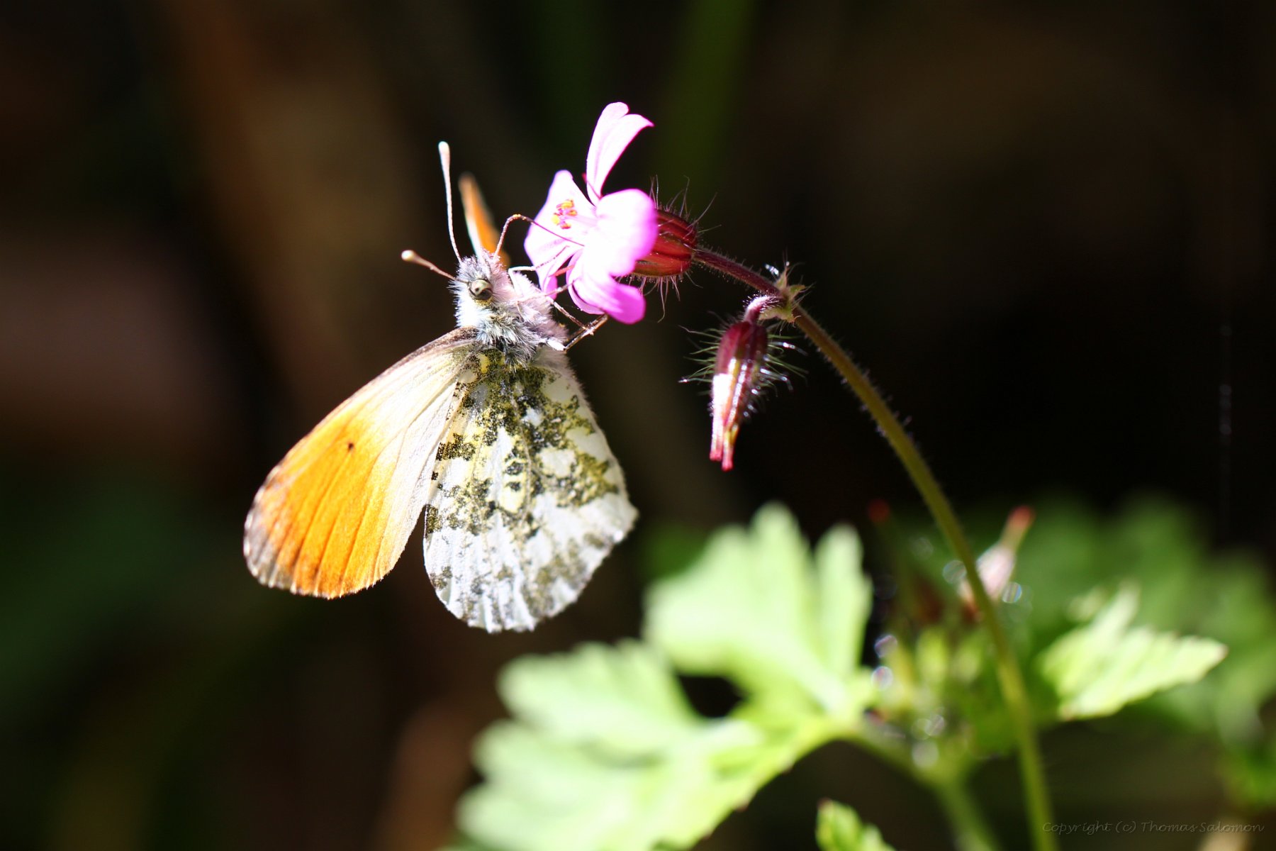 Ein frisch geschlüpfter weiblicher Aurorafalter (Anthocharis Cardamines). Schön zu sehen die schwarz-grünen Flecken auf der Flügelunterseite. |