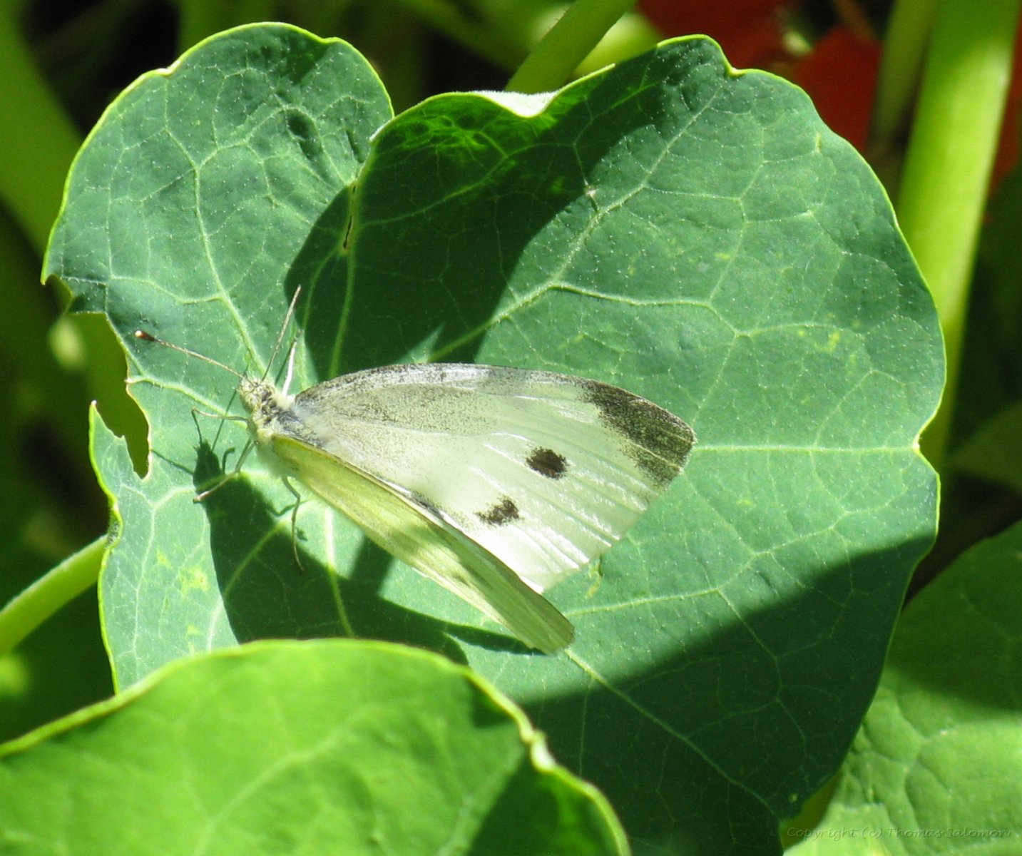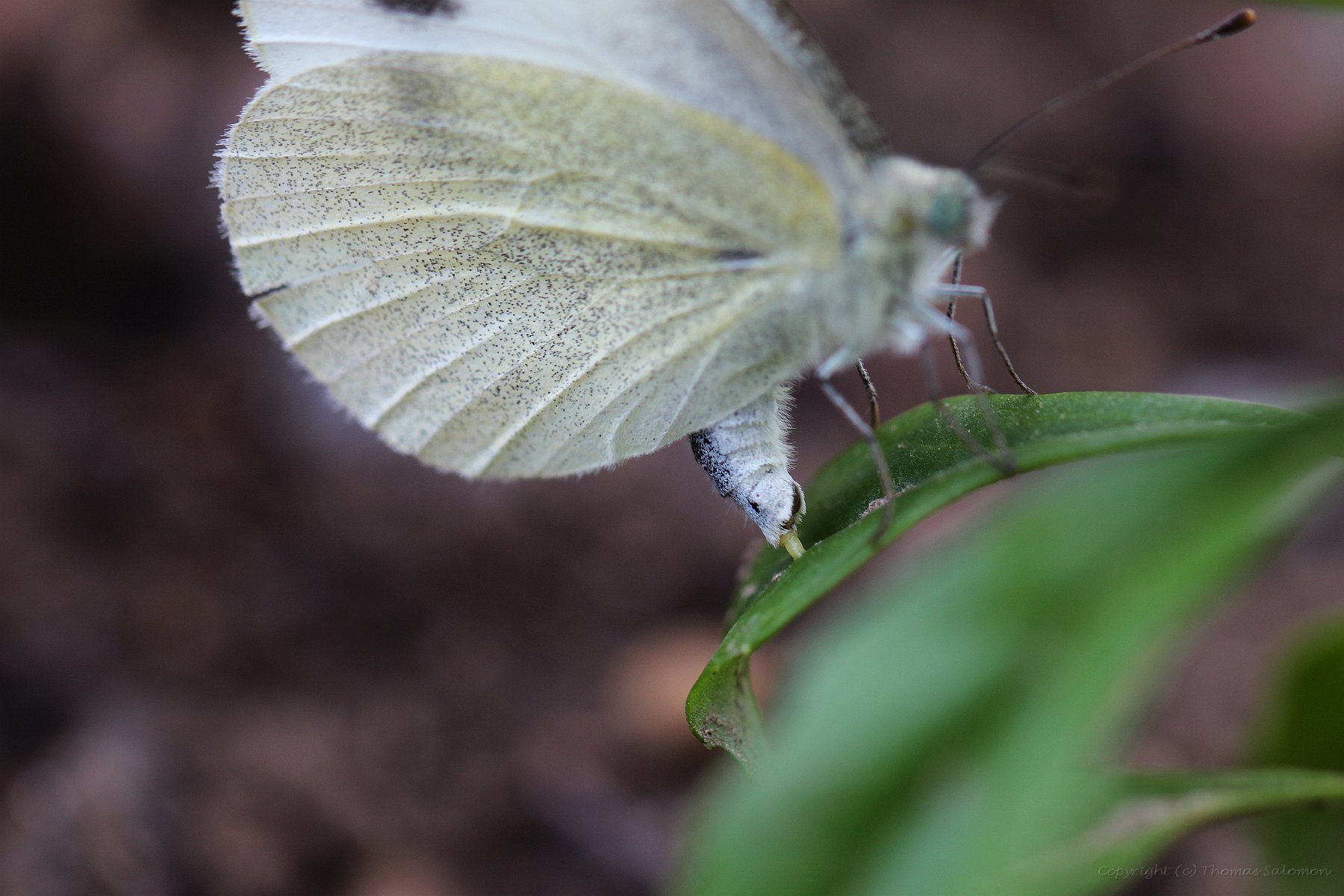 Ein Weibchen von Pieris rapae (kleiner Kohlweißling) bei der Eiablage. Deutlich kann man den Austritt des Ei's sehen.