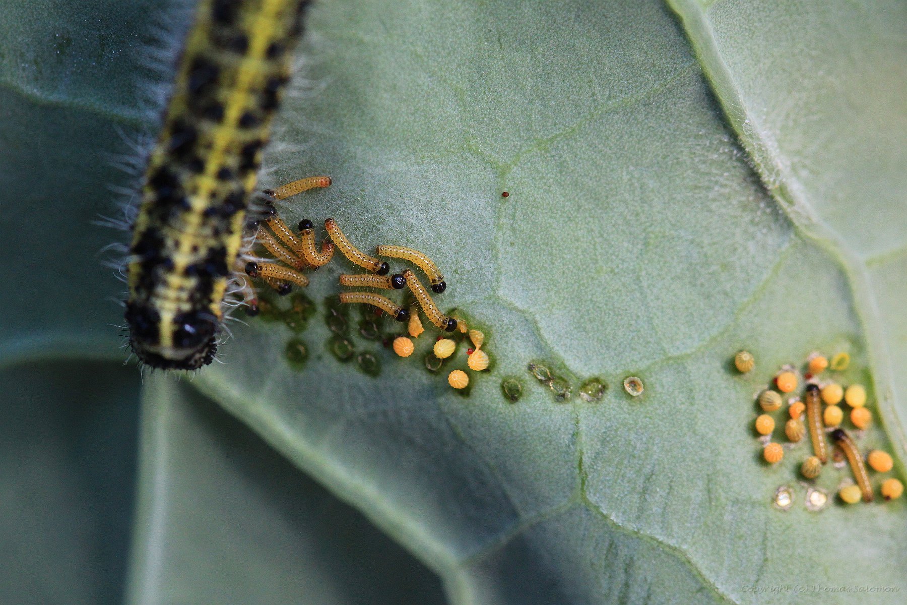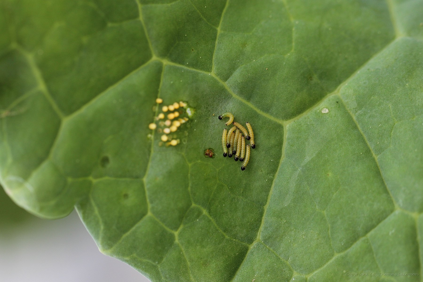 Eier und frisch geschlüpfte Räupchen von Pieris Brassicae. Als erste Nahung vertilgen die Kleinen ihre Eihülle, erst dann machen sie sich über das planzliche Futter her. Links eine ausgewachsene Raupe der gleichen Gattung, die im Verhältnis riesig ist.