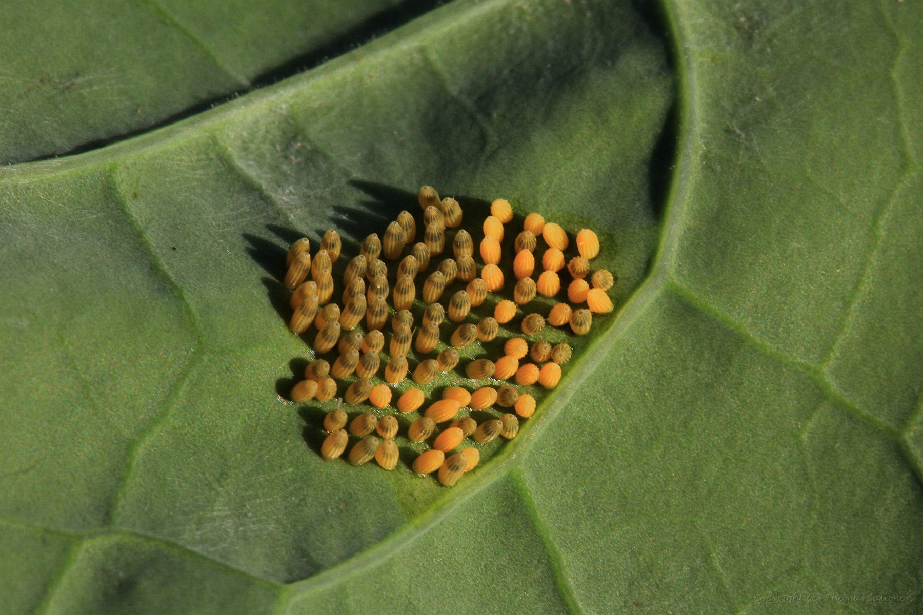 Eigelege (ein sog. Eispiegel) des großen Kohlweißlings (Pieris brassicae)