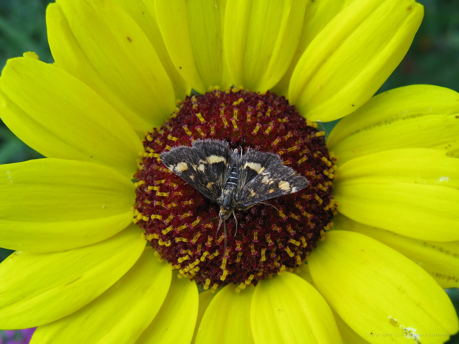 IMG 2686    Dieser Zünsler (verm. Eurrhypis Pollinalis) ist winzig - er hat max. 15mm Spannweite.